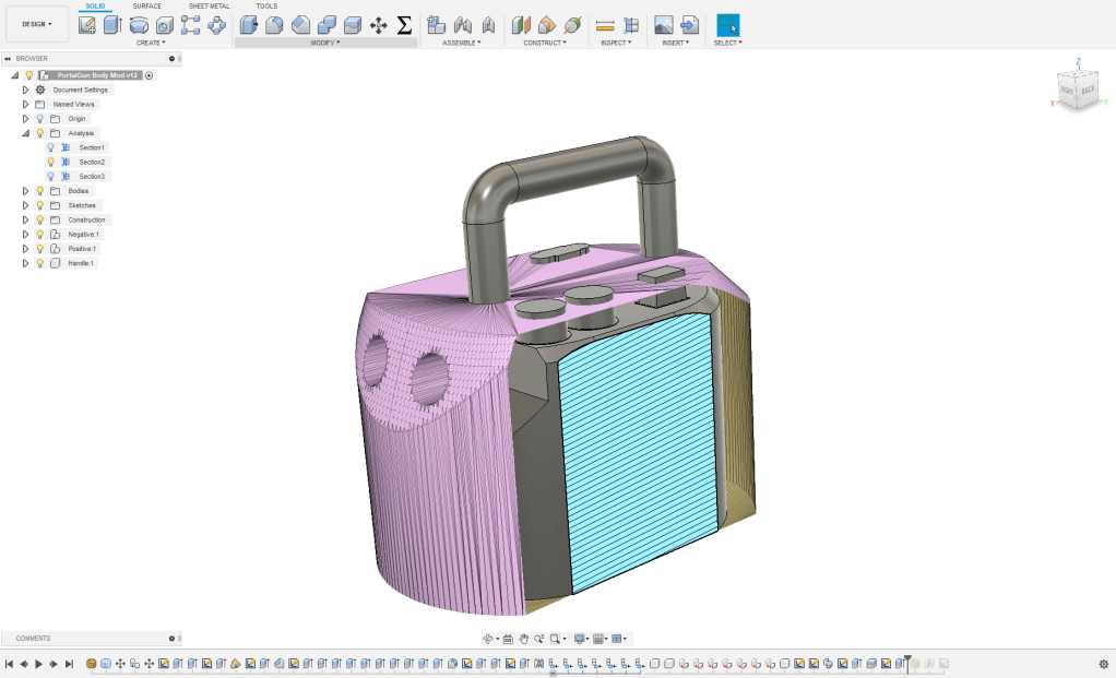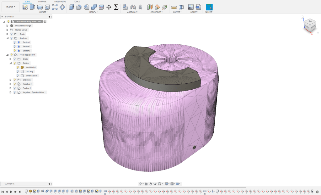 The challenge I faced now, was that the files for the Portal Gun were not easily editable. In STL file format they are considered meshes when imported into Fusion 360 (seen in pink in the above photos). I cannot take dimensions easily and sketch out new designs on the faces of the model for what I want to modify. Now, it might be possible to edit the mesh in Blender (or I guess Fusion 360 does have a basic mesh editor), but the mesh is usually of a higher resolution, so the number of triangles the mesh is made from is rather high and not necessarily uniform in any useful way for me to edit.