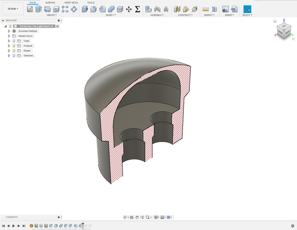 After having printed and assembled the Portal Gun, and having some time to handle it, I found several things that I wanted to change with the design of the model. First, the inside cavity was not nearly large enough to provide space for the electronics and wiring I wanted to shove in there. Second, I wanted to mount switches and buttons on the back of the gun near the handle, so it needed holes for those. Third, I wanted a number of the parts to be able to assembled using hardware (screws, nuts, etc.) vice glue. And, last, the in-game model had a light on the top of the body of the gun, so I needed to be able to print that part separately so I could mount LEDs inside of it.