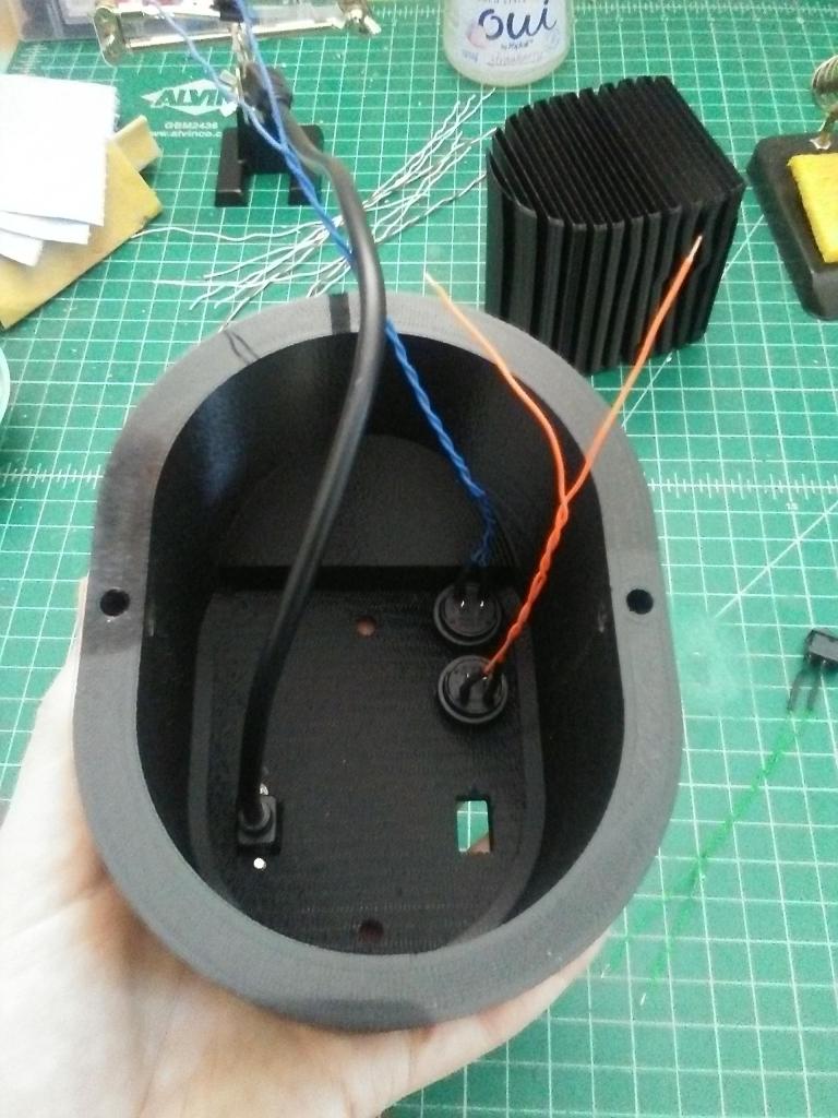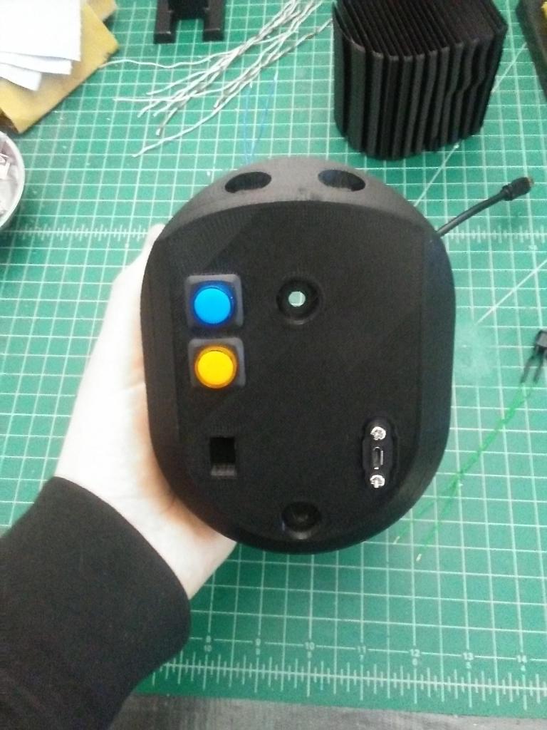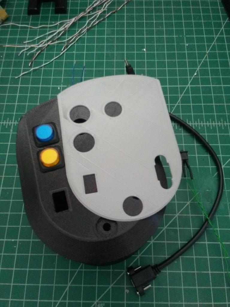 First print is a one layer print of the button layout on the body to make sure everything’s laid out correctly and feels right. At least as right as it can with my large hand awkwardly crammed up under the back part of the outer shell. One minor tweak to positioning and a 3D print later, and I was able to start mounting the buttons and charging cable plug.