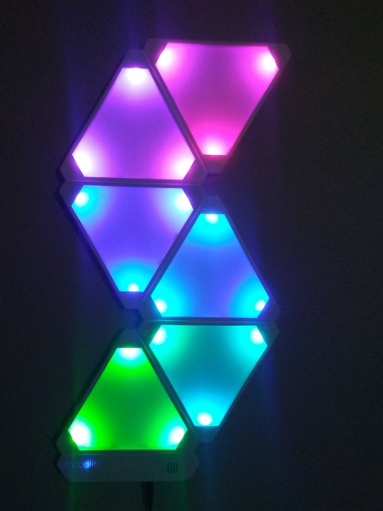 So far I’ve only taken the time to print and solder up 6 panels, however, I’d like to make some more, maybe another 6 or so; just to fill out the wall a little bit more. With the little time I’ve spent playing with the WLED app, I’ve figured out how to set them up to automatically turn on/off and have several preset programs picked out to run already. Every now and again, I’ll stop to play with the app and explore what other lighting patterns I can set them up with. All-in-all, a fun and de-light-ful project. I recommend hopping over to moodlite.co.uk to check out all the different build logs and pictures the members over there have posted as there are some pretty neat setups that they’ve shared.