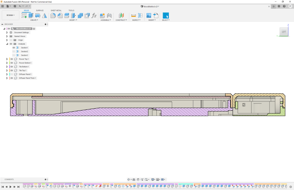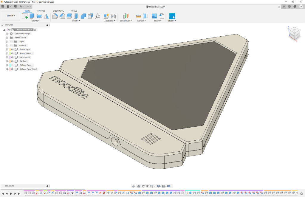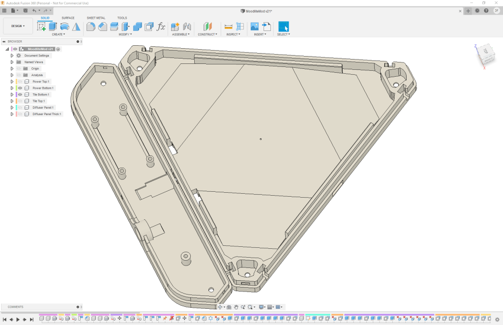 Once I had the electronics side of things squared away, I decided I wanted to tweak the CAD files (as I seem to do with most of my projects) for the Moodlite panels and come up with my own diffuser cover design. Similar to some other members on the forum, I found I got more uniform and better diffusion of the light with the top panel being a greater distance from the LEDs. This made the overall panel thicker than the original design, but kept it flush with the thickness of the controller case. I’d also decided to print the diffuser panel in a natural clear filament as a separate piece than the white top frame. While this worked out quite nicely with me hot-gluing the diffuser panel into the top, I really think I should go back and take the time to model in some snap points to properly hold the panel instead of just relying on glue. Anyway, with my tweaks made, it was off to do some test prints and get everything soldered together.