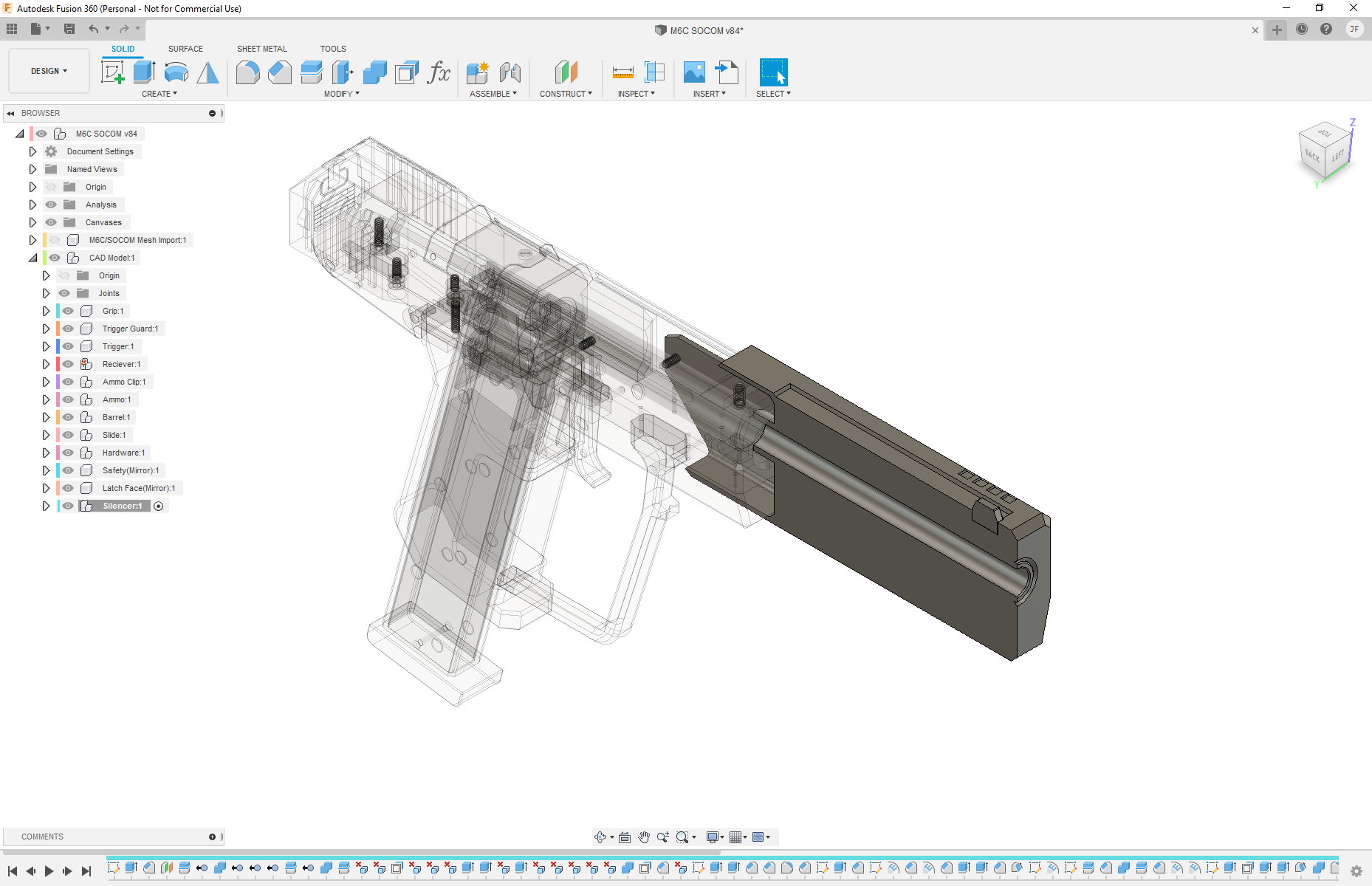 Anyway, with the base M6C variant pistol complete, I moved on to the silencer and flashlight that made the M6C/SOCOM so iconic in Halo 3: ODST. As there were no moving parts on the silencer, it was relatively quick to model and was the perfect size to print as a single piece, standing on end. I was quite happy to not have to split it up anywhere and introduce seam lines to the finished product. After that, I needed to work on the flashlight below it. Now, on the in-game model, the flashlight seemed to be a more-or-less integral part of the silencer. There didn’t seem to be an indication of how it was mounted or if there was even a way to take it off. For my purposes, to be able to print parts without support, I needed a way to separate the flashlight from the silencer. One of the nice things about having so many references from so many other people who had made replicas, is that there were plenty of ideas for me to glean inspiration from of how to accomplish this. The most popular method seemed to be mounting it to a picatinny rail on the bottom of the silencer. It was a perfect way to mount it that made sense for the flashlight as an attachment. That said, the in-game model did not have a picatinny rail (at least one that showed on the model). So, I decided to model the rail short enough that the flashlight body would completely surround it, and hide the rail – perfect! Just what I needed, and I would be able to print the picatinny rail as a separate piece and the join seam to the silencer would be hidden, everything would be jointed mechanically, and I could take everything apart later.