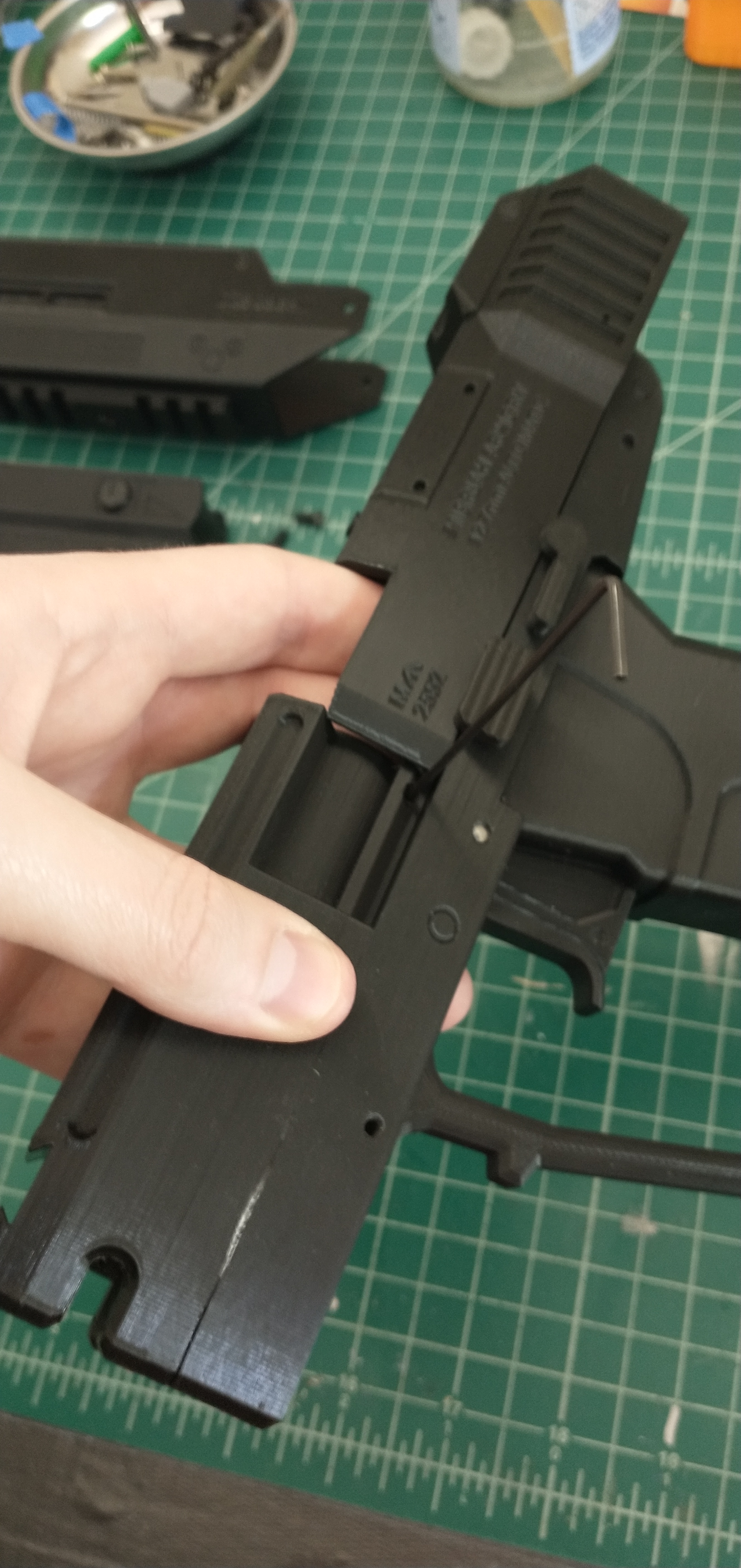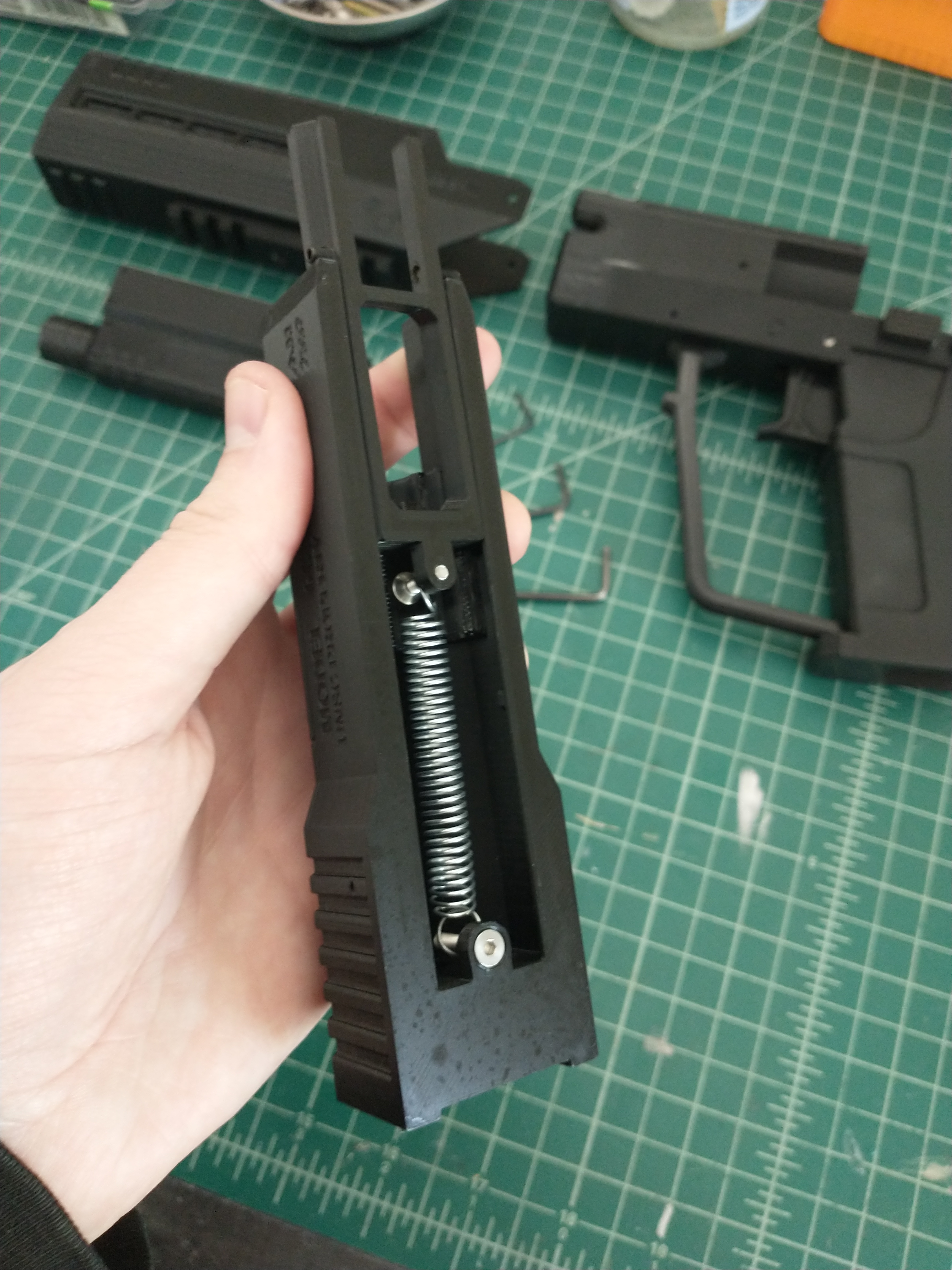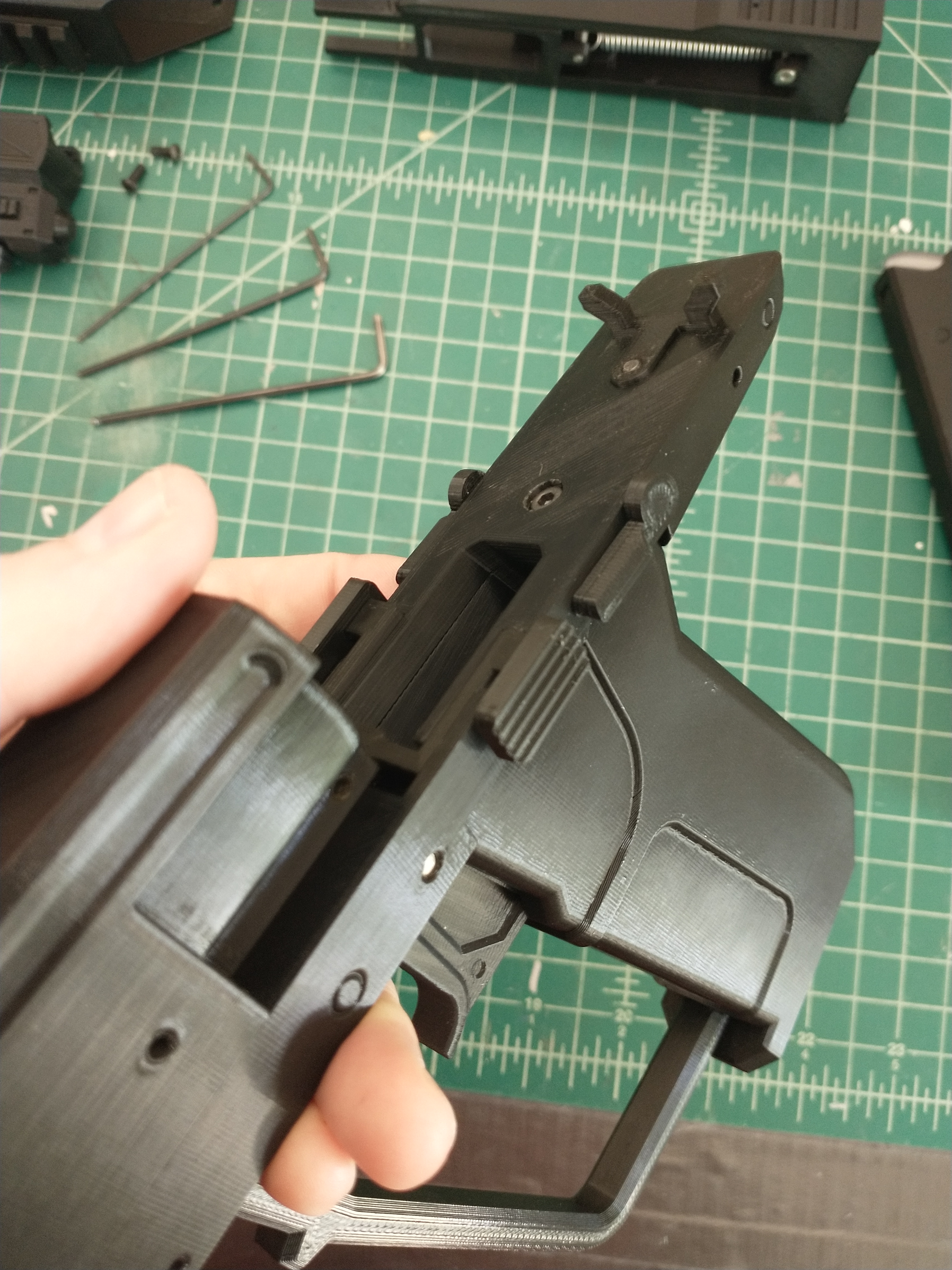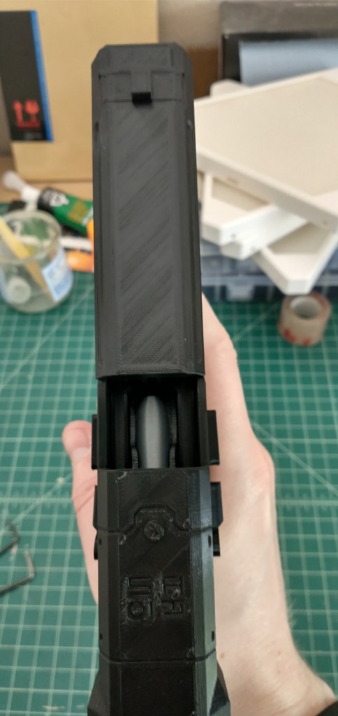 Once the parts had finished printing, it was time to assemble what I had and make sure it all fit correctly and worked the way I expected. And, so far so good. Everything lined up and went together fairly easily. The most challenging part of the assembly to deal with was the spring for the slide. I’d toyed around with using a compression spring in a similar manner to one replica I’d found online. But, I just couldn’t get the design right, and without ordering custom springs I wouldn’t get the travel distanced I wanted out of the slide. So, I’d settled for using a tension spring instead. With how I’d designed the body and slide, there was really no good way to access the inside to install the spring with the slide on. But I couldn’t take the slide off, cause I needed it to be mounted on the body of the pistol to attach the two together via the spring. In one of my test 3D prints of the model, I’d tried installing one side of the spring on the body and reaching trough the bottom of the slide to pull the spring back and slip it over the pin on the slide, but that seemed to just end in failure no matter how hard I tried.