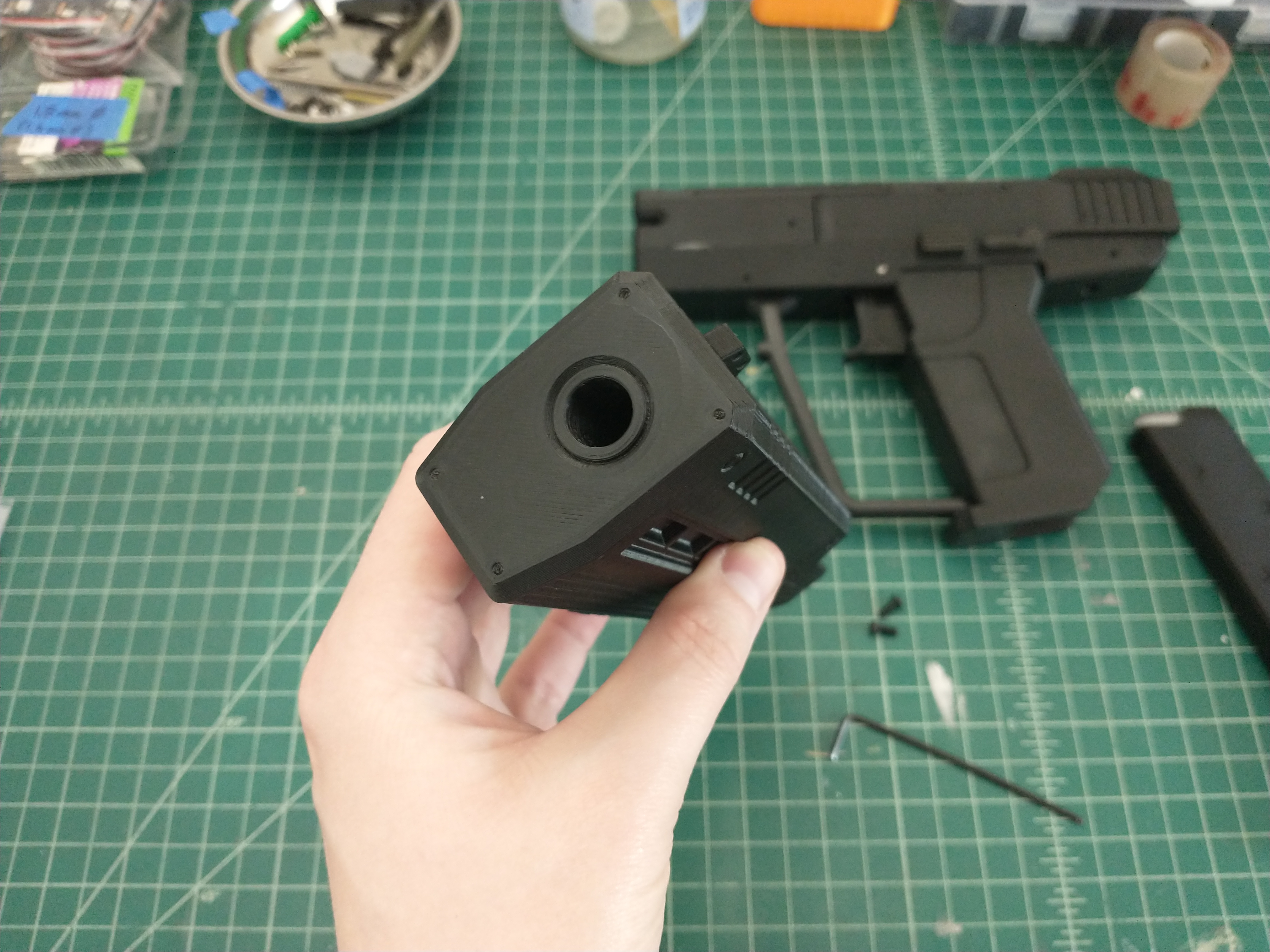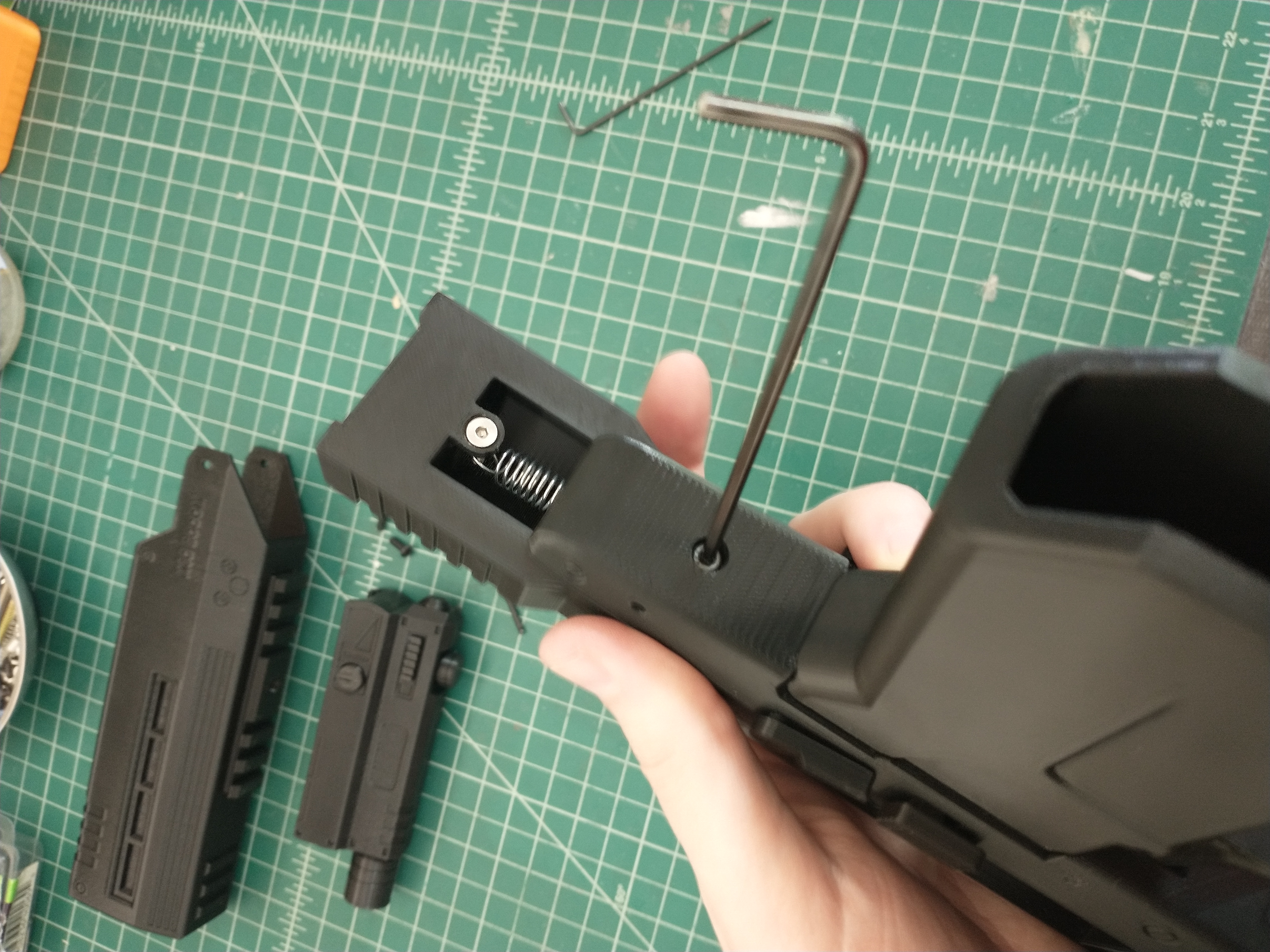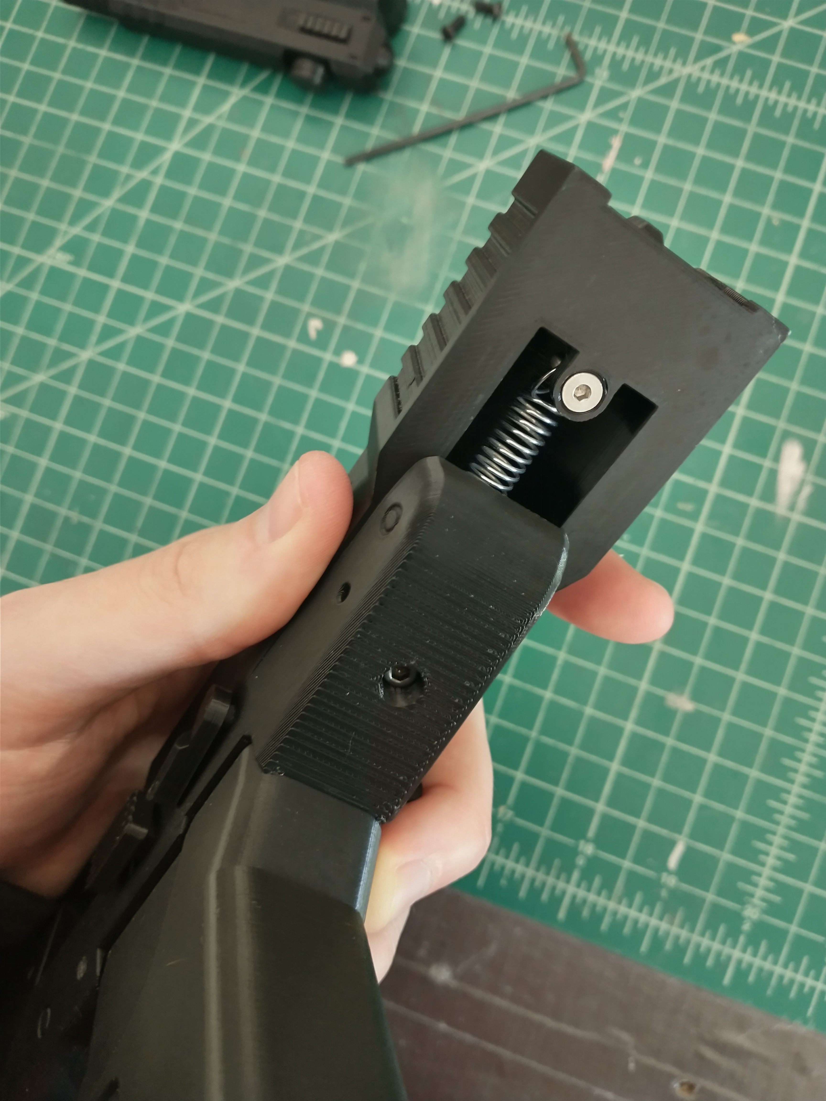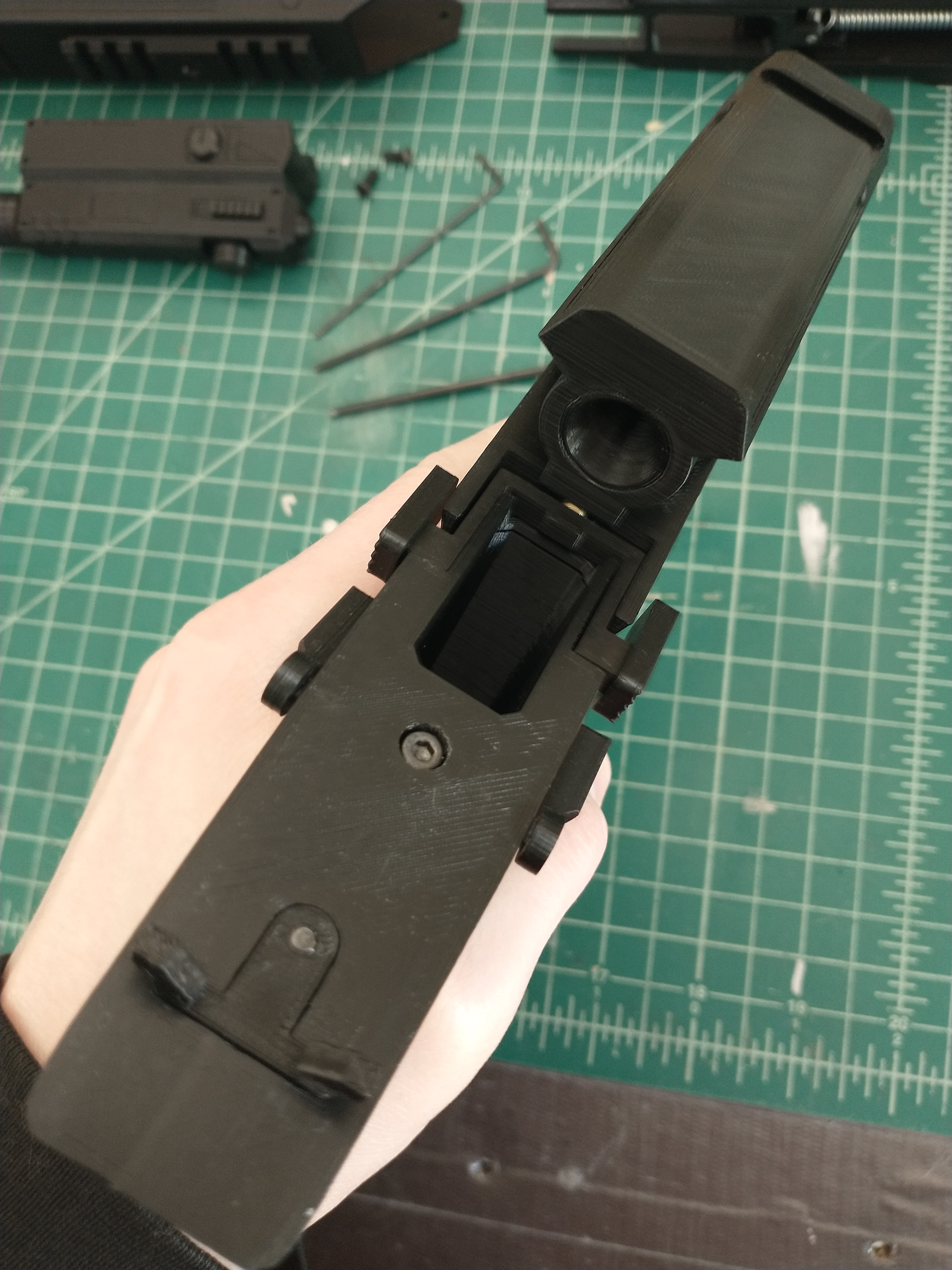 Once the parts had finished printing, it was time to assemble what I had and make sure it all fit correctly and worked the way I expected. And, so far so good. Everything lined up and went together fairly easily. The most challenging part of the assembly to deal with was the spring for the slide. I’d toyed around with using a compression spring in a similar manner to one replica I’d found online. But, I just couldn’t get the design right, and without ordering custom springs I wouldn’t get the travel distanced I wanted out of the slide. So, I’d settled for using a tension spring instead. With how I’d designed the body and slide, there was really no good way to access the inside to install the spring with the slide on. But I couldn’t take the slide off, cause I needed it to be mounted on the body of the pistol to attach the two together via the spring. In one of my test 3D prints of the model, I’d tried installing one side of the spring on the body and reaching trough the bottom of the slide to pull the spring back and slip it over the pin on the slide, but that seemed to just end in failure no matter how hard I tried.