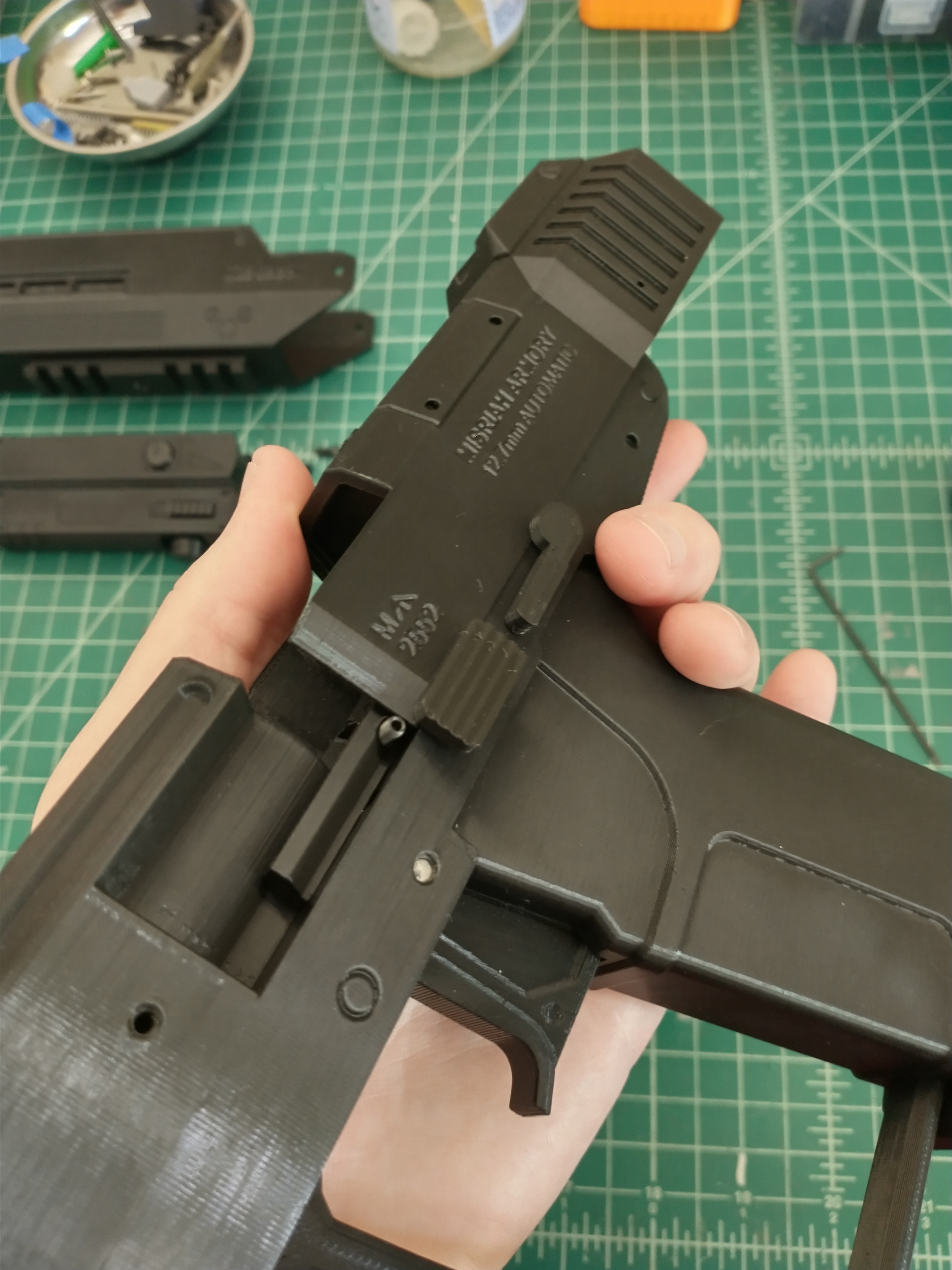 As with my other 3D modeling adventures, it took a bit of trial and error to get the model to look correct and piece together nicely. All the while I was thinking about how I would print each piece, what parts would need support, where I would have to cut it to make parts mate correctly and look nice without too much post processing, and where I was going to add hardware to screw everything together. A few of the features that I knew I wanted in the pistol, was a movable slide – bonus points if I was able to make it chamber a round correctly (spoilers, I was not able to figure that mechanism out, probably a good thing – don’t want to make too realistic of a replica), a removable mag with ammo, and a moving trigger. Additionally, I wanted to pack in as much detail as I could from the in-game texture. Which, surprisingly, I was able to get the text on the side of the pistol to turn out nicely.