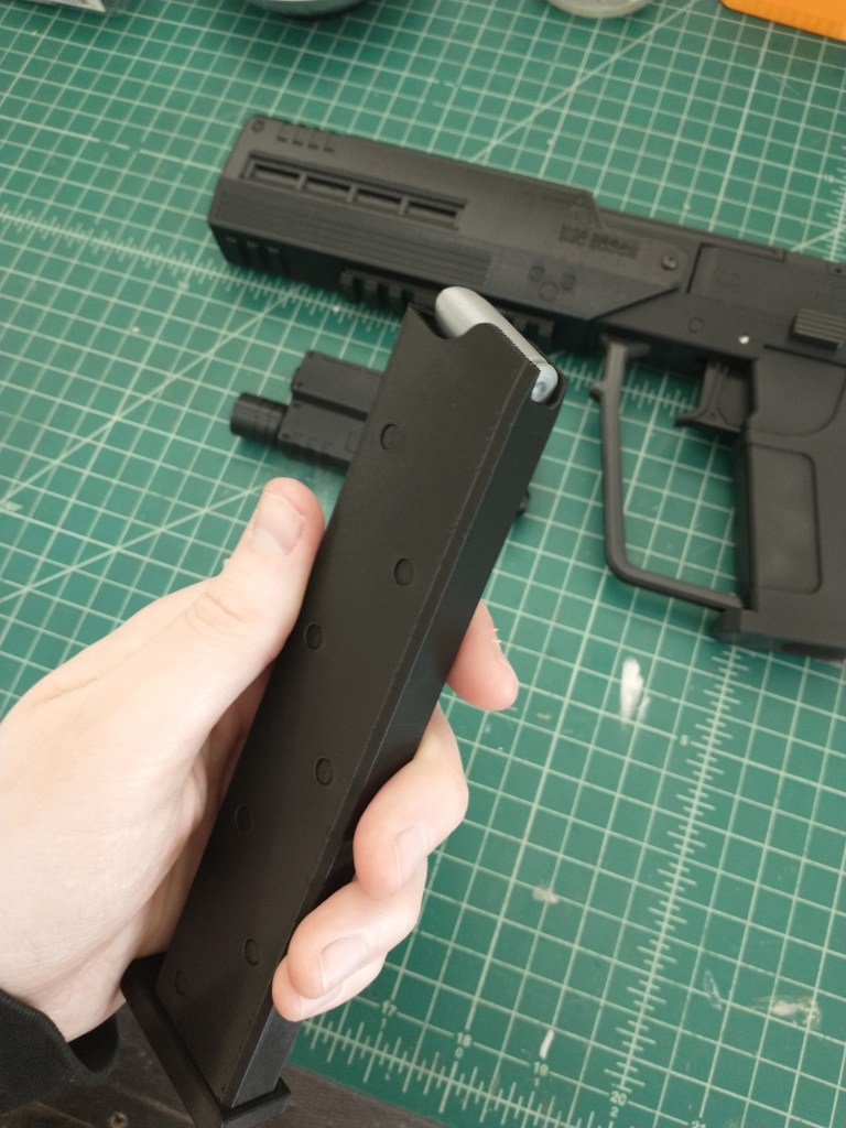 The additional challenge I’d had in the designing of this replica, was the ammo clip. I was thrilled that I’d figured out how to make a functional (albeit simple) release for the clip so that it was removable. The challenge though lay in it holding the ammo. I’d originally thought it would be a novel idea for it to hold the same amount of bullets as in the game, and there was plenty of space to do that in the model. However, I’d again need a custom spring similar to a real ammo clip to make it work, and there was no way I was going to go the distance to get a custom spring like that. In the end, I settled for just a simple clip design with a single bullet showing at the top. It still gave the replica the cool functionality of being able to pull the slide back and see the bullet ready to be chambered.