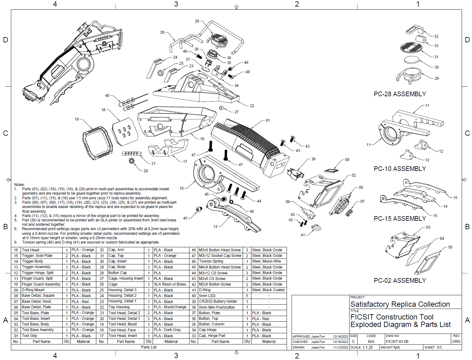 With the 3D model complete, it was time to send parts off to the printer. And while those were printing, it was time to make an exploded diagram and parts list for the replica. I tried something different with the sub-assemblies in the model, showing them separately instead of my usual of making a note about them and leaving them shown assembled. There were a lot of small pieces to this model and the drawing ended up looking rather crowded in some areas, but I think it turned out alright. It took me far longer to make this drawing though, than some of the others I’ve done. (Story of my life with this replica it feels like.)