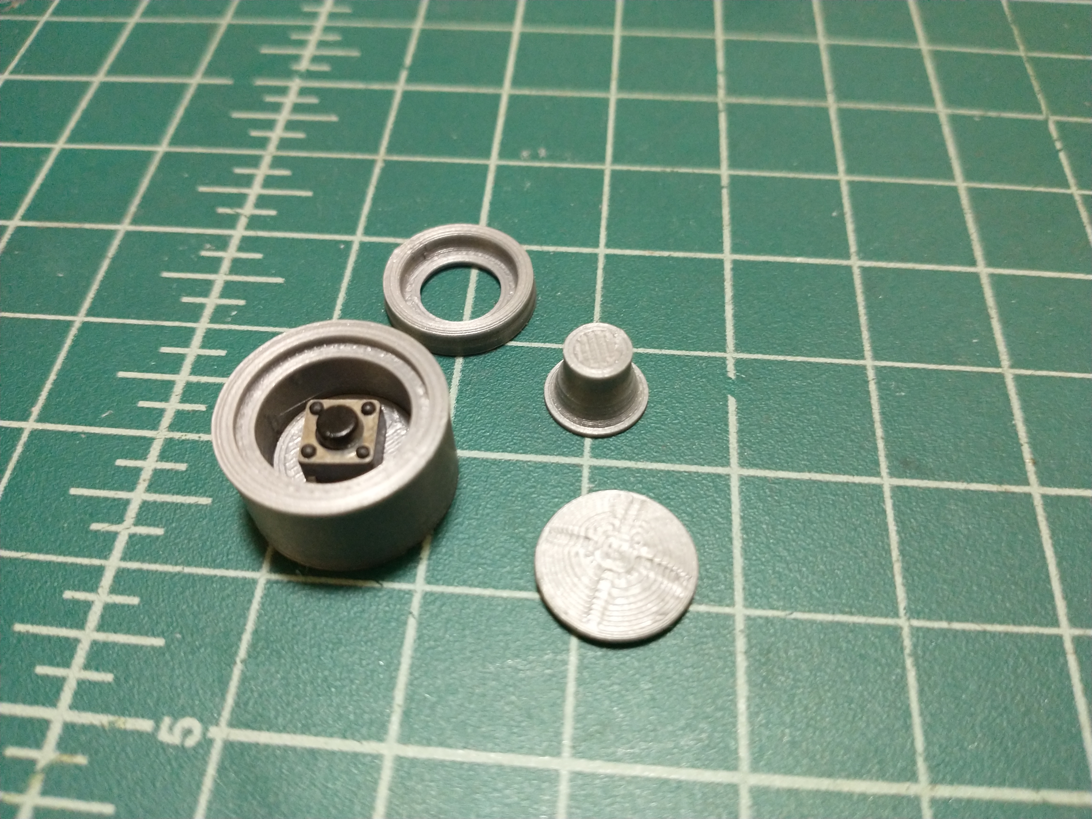 Anyway… in my last post I talked briefly about how I did my best to hollow out the model, locate electronics, and make it easy to swap out the battery. I was still of the opinion, even more so after printing it out, that all I was really able to be going to fit in it was a set of LEDs hooked to a small battery with a mini-pushbutton to turn it on. And even while I was printing things out, I wasn’t sure how I was going to go about fitting up the pushbutton in the print. I ended up doing a couple test prints to get the button just right and ended up going with a design similar to a set of print-in-place pushbuttons I found via Hackaday, by Marc Schömann.