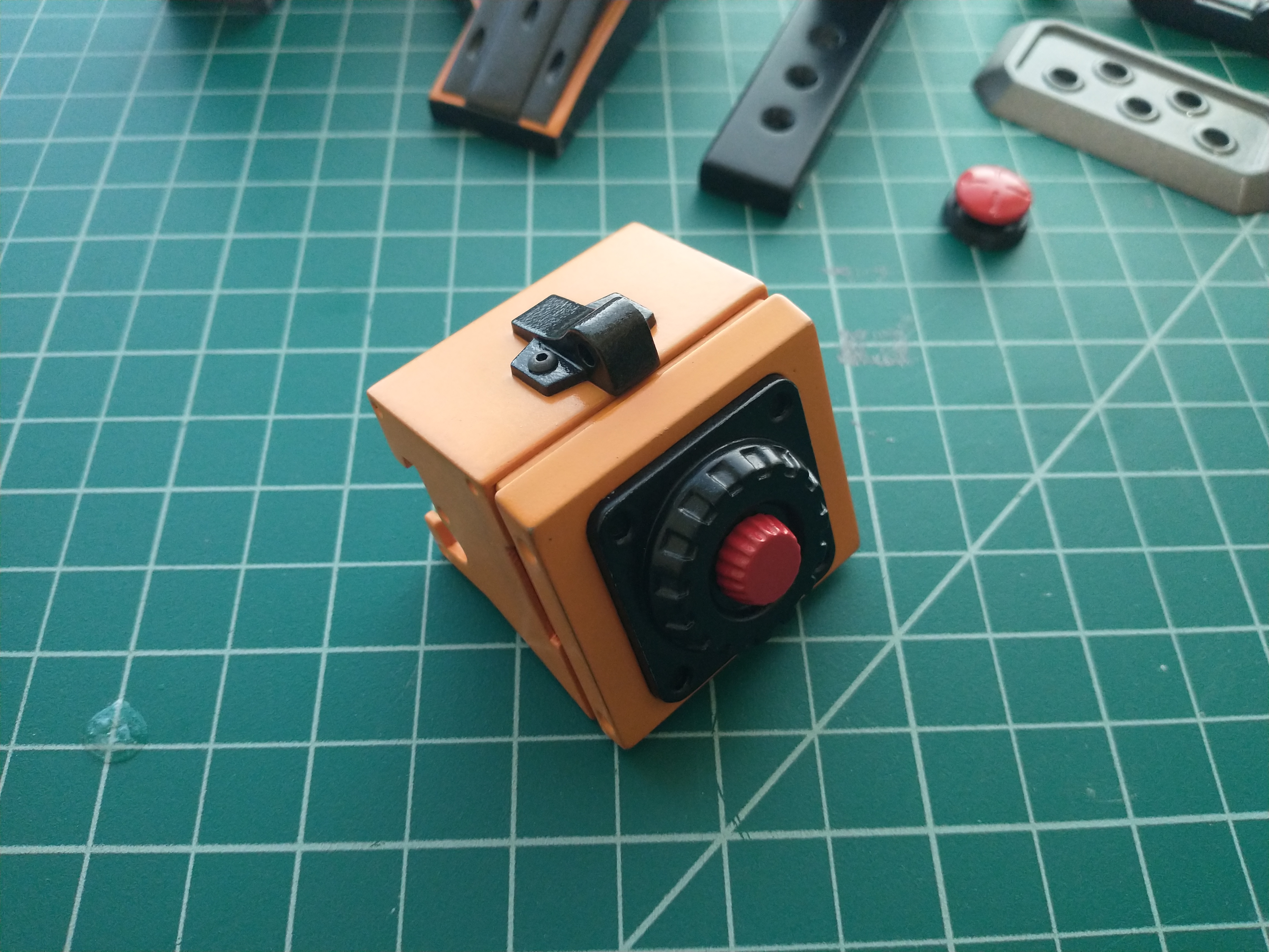 All the parts to assemble. Painting the top plate was interesting, lots of masking tape. Not sure if I like how it turned out, and I keep wondering if there was a better way to break up the model so I could paint things independently. The model for the button cap was split fairly well, making it easy enough to paint, though assembling and gluing it so that it was straight, was a bit challenging. I also found that once painted and assembled, I had to do some manual modifications to make it close properly. I had designed the model so that it fit properly and closed correctly right off the 3D printer as a raw print, but I’d forgotten to take into account how sanding and painting would change the dimensions and tolerances of the model. The addition of the paint added some thickness to the hinge and changed its positioning, making it so the cap didn’t want to close all the way. After pondering how to solve the issue, I found the best solution was to enlarge the inner diameter of the hinge so that there was plenty of clearance for it to have enough wiggle-room to shift on the screws and sit flat when closed.