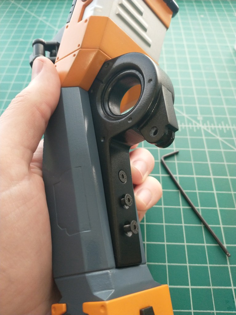 Assembling the finger grip on the handle; 3 screws may have been excessive, but it looks good and hides the two screws underneath that hold the head and the handle together (cause I like to be able to take things apart). I’d worked hard to get the sizing just right to be able to hold it similar to your character in-game, and I like to think I did well, even if the hole for your fore-finger ended up being a little larger proportionally than it was on the actual model. Unfortunately my fingers can’t clip through things like the game character model’s can.