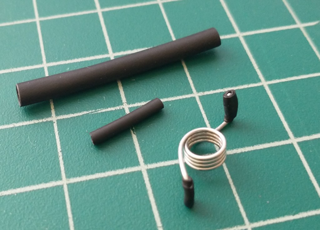 Next, the assembly of the trigger with the spring. I decided last minute to cover the ends of the torsion spring with heat shrink tubing to hopefully protect the paint from the metal spring. I was worried I’d end up with scratches from the spring’s movement. Two layers of black heat shrink worked well and helped to hide the spring better too.
