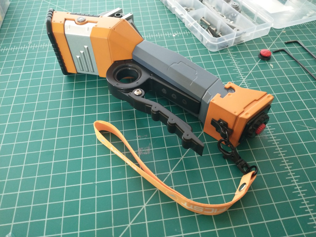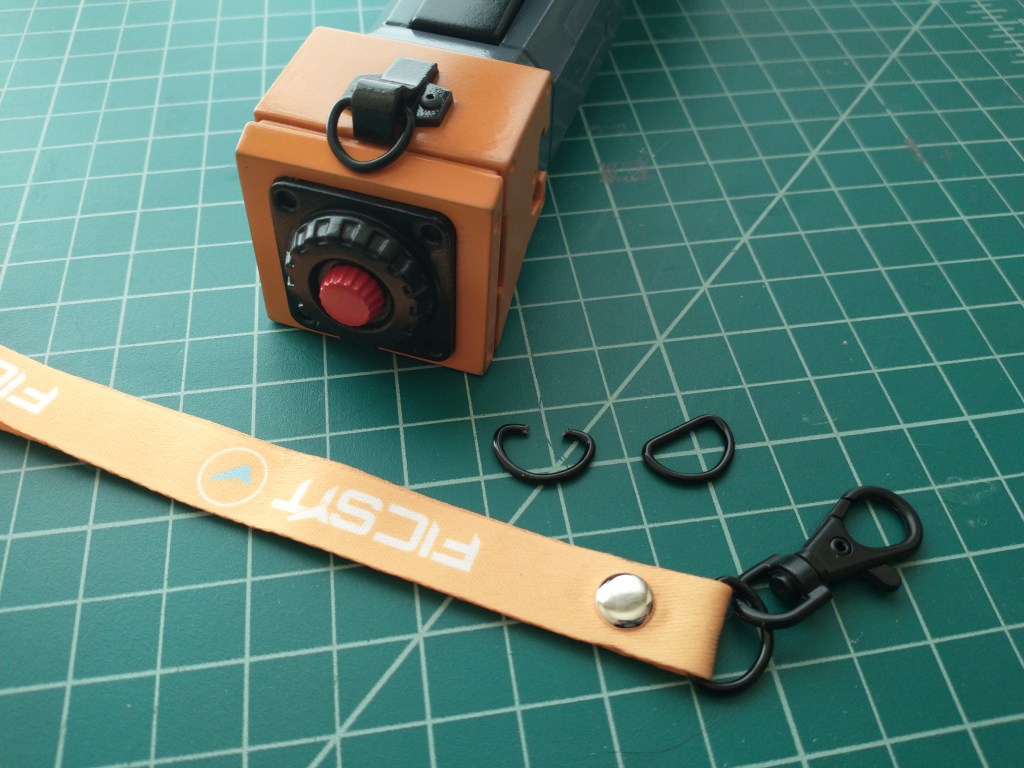 After that it was time to attach the D ring and lanyard. And speaking of the lanyard, when I was finishing up this model, I saw that Heroic Replicas LTD was selling a lanyard set. Which was absolutely perfect, and the moment I saw they had it, I knew I had to have it, if not for this replica project, then just to have it. I’d already bought a couple of their other key-chains and other Satisfactory merch, so this was a no-brainer. Previously I’d been wracking my brain about how to make or get a small lanyard similar to the one in-game on the build tool. So this was absolutely perfect timing and I could not be happier they decided to make a that lanyard set!