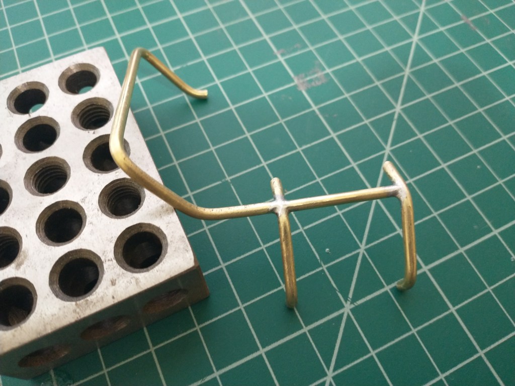 I didn’t take pictures at all during the bending and soldering process, because I just did not have the patience to do so, even though it would have been more informative than rambling on about my frustrations. Anyway, I decided to by some solid 3mm brass rods, along with them I also bought a small butane kitchen blow torch to be able to anneal the brass with. Heat it up using the blowtorch to make the metal softer and then bend it with pliers, sound simple right? Apparently I was wrong. Solid 3mm brass was probably not the best choice, as that’s a lot of metal to actually bend, and it did not want to do so very well. The other half of the frustration came from the fact that I did not have a bending chart for the brass rod, and had to go as best I could from hand-written dimensions from my CAD model. In addition to that, I learned my dimensions in the model were not going to work as well as I thought. I thought the brass would have enough flex in it, so that I could easily bend it into position on the model. Nope, solid brass rods are very stiff, on account of them being solid brass, go figure.